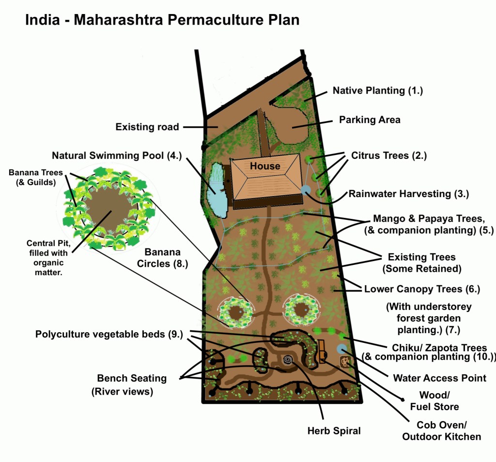 The image above shows part of a permaculture design for a riverside plot in India, with an approximate location for a new home, with a natural swimming pool. A path leads down between fruit trees and a forest garden to a seating area and polyculture vegetable beds situated near the riverside end of the property.
