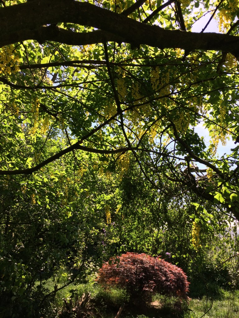 Nitrogen fixing trees play a vital role in restoring degraded land, and can serve as a source of vegetative material to feed other parts of a garden. In one part of my garden, this laburnum serves this function.