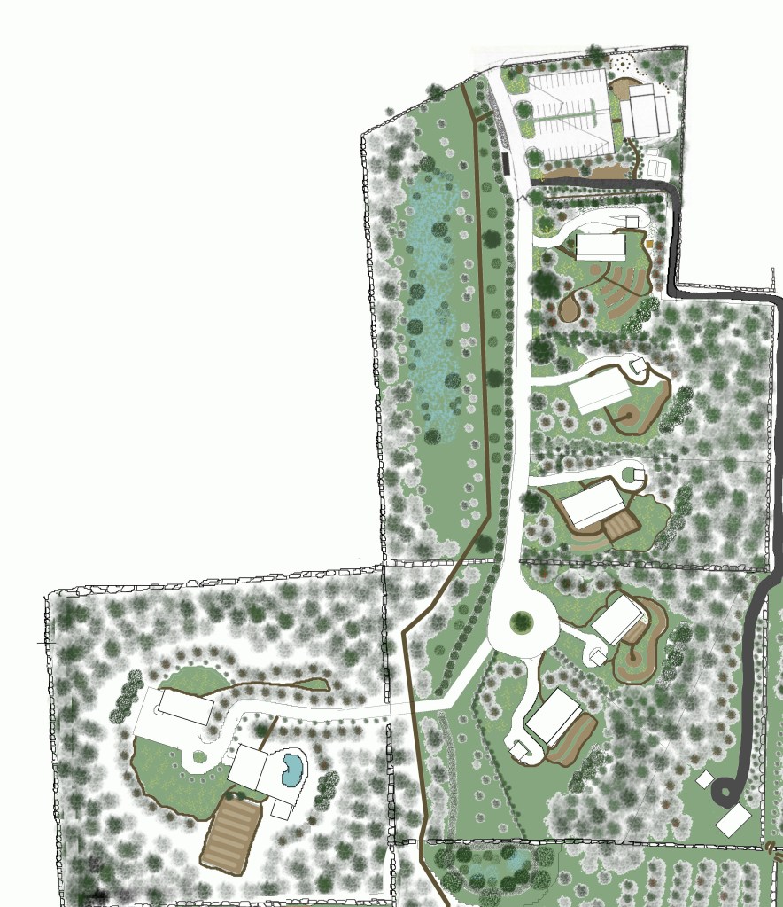 The above image is another portion of the permaculture design I was working on in New York State. This portion of the plan shows the scheme to create six multi-generational eco-friendly and sustainable homes. Each one has garden utility and functionality which enables a greener way of life. A community barn and farm stalls (to the top of the plans) will serve the needs to these residents, and also the wider local community.