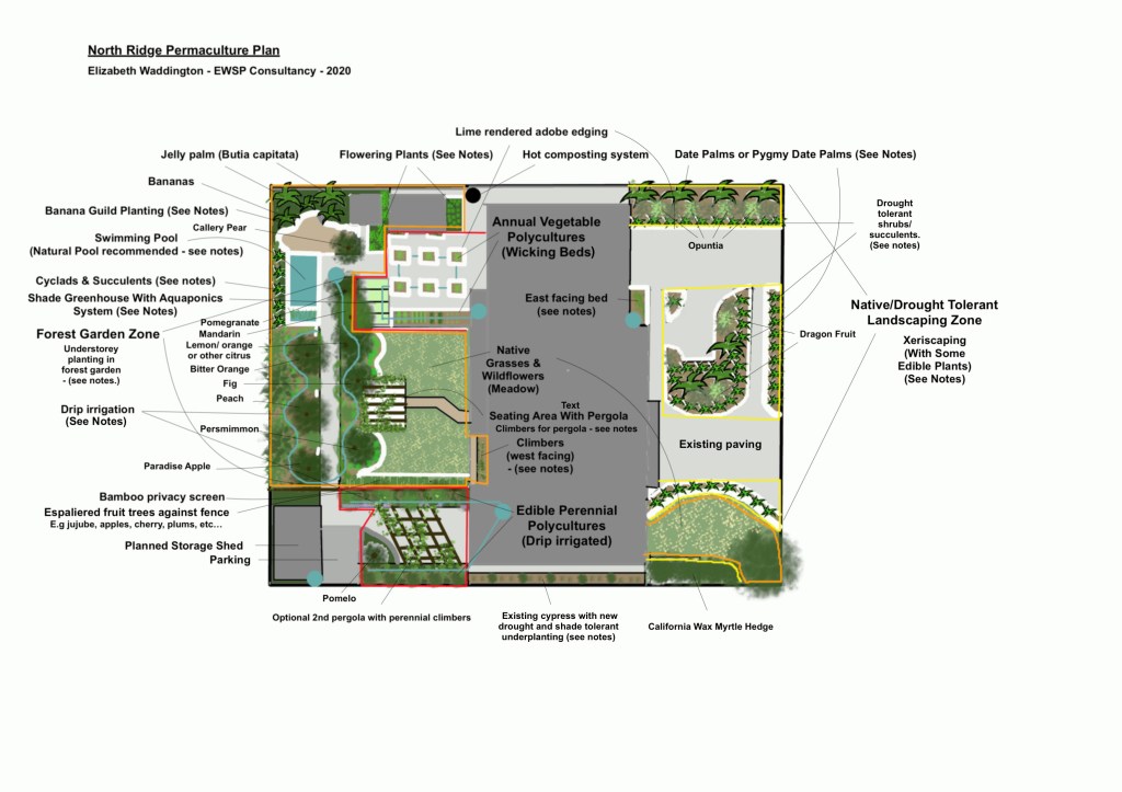 This permaculture plan is for a property located in North Ridge in the San Fernando Valley, LA. The goal was to create a sleek and modern garden which could also provide plenty of edible produce without requiring excessive amounts of gardening work.