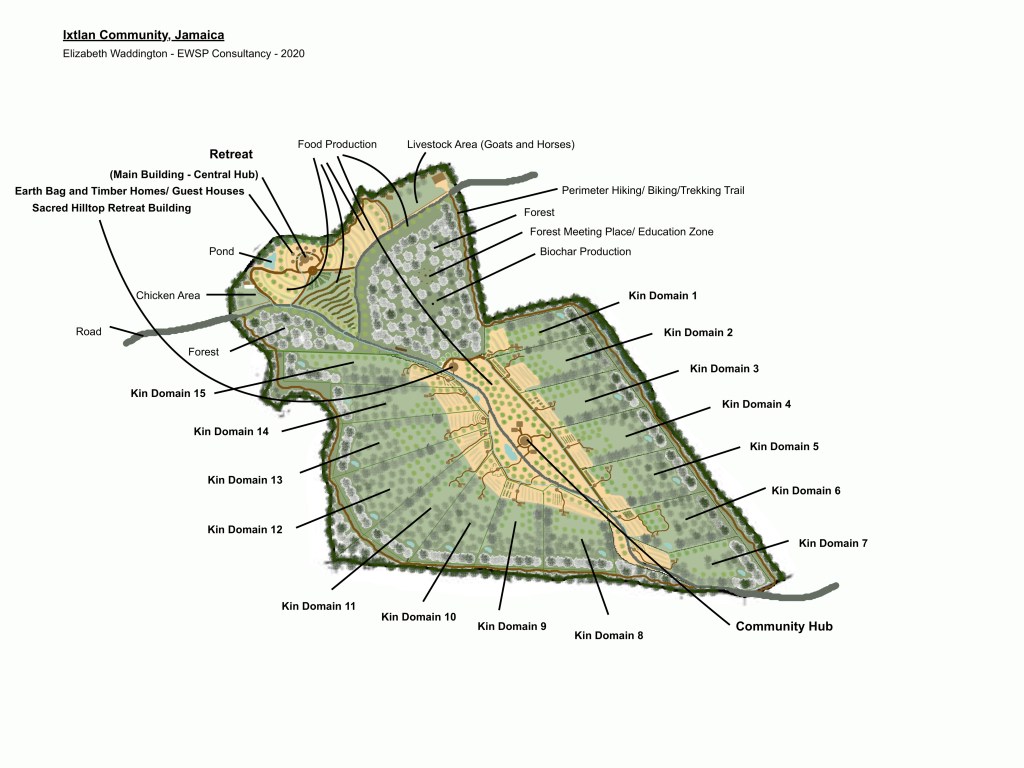 The image above is part of a permaculture plan for a retreat of around 20 acres, and a further 30 acres divided into 15 two acre kin domains or family homesteads. A sustainable project in Hanover county in Jamaica. Designed to protect, restore and nourish people and planet on this 58 acre site.