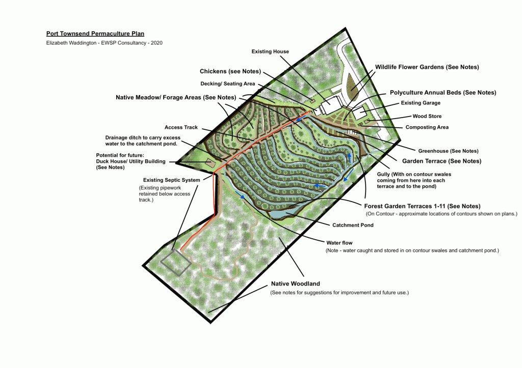 This design aims, first and foremost, to manage water and stabilize soil on the site, which has slope of 20-30%. A series of twelve terraces, with on-contour swales, are the predominant feature of the design. The goal of these is to slow water egress and develop a forest garden system with plenty of fruit and nut trees, fruiting bushes and other perennial planting.
