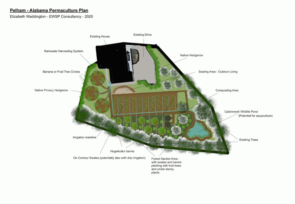 This is a quick design for a domestic backyard in Alabama. The site slopes downwards towards the east, and the client asked for a design that would allow them to make the most of the site and grow their own fruit and vegetables.