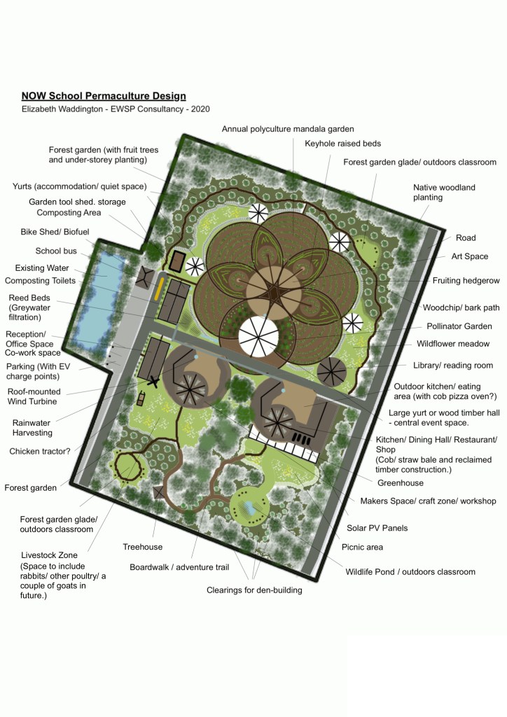 This design aims to provide all that is necessary for an education of this sort, while also providing for the needs of the surrounding community. It also involves enabling a care of people and planet. And the creation of thriving and biodiverse food producing and wild woodland ecosystems that benefit the local and global environment.
