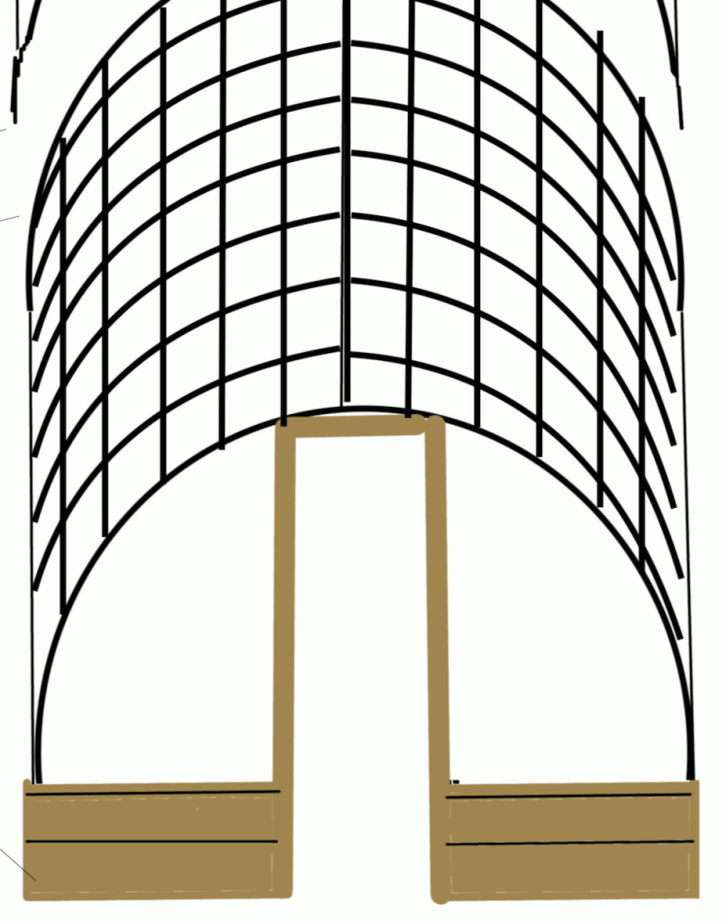 One simple way to create the trellis structure is with cattle panels. These form arches over the two beds, with a path between them. They are held in place by reclaimed wood outer bed edging on the two beds. The beds can be filled using the usual method used to make ‘lasagna’ no dig beds.