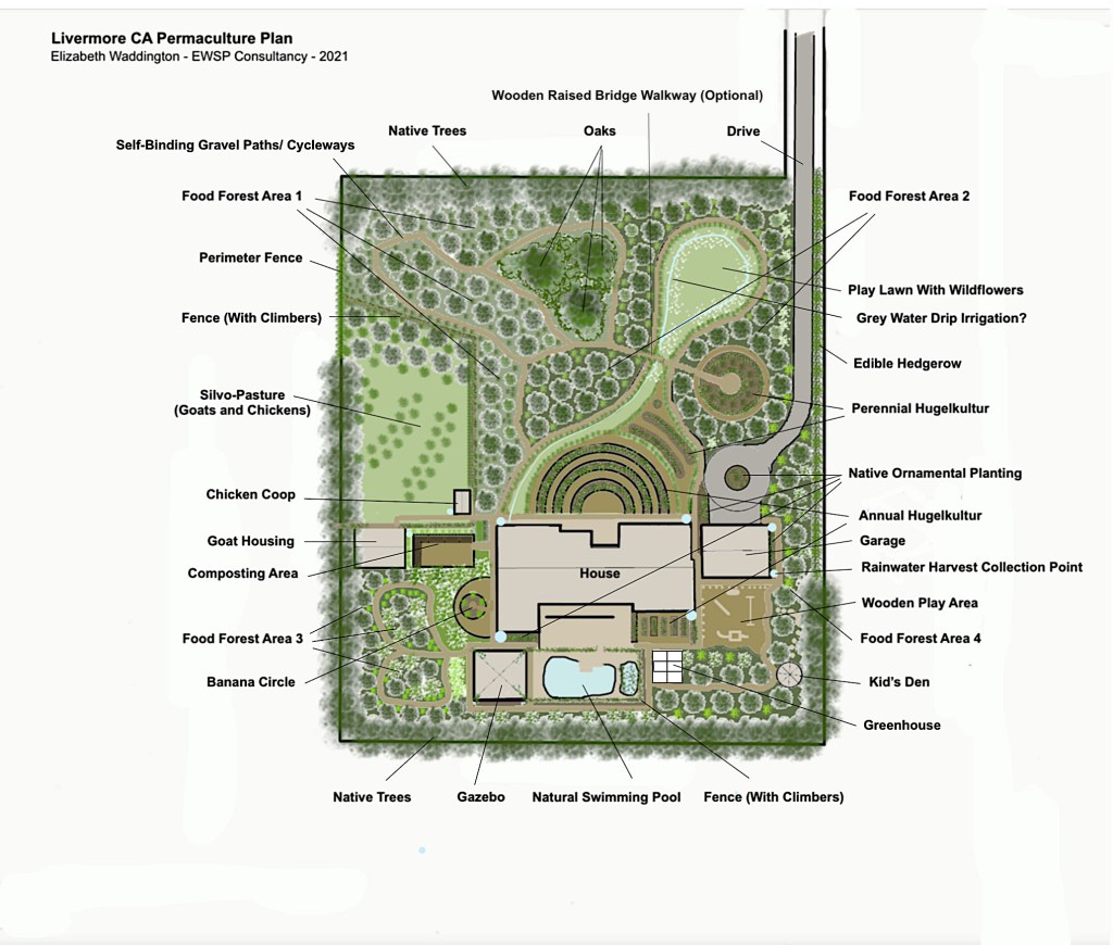 The site is in Livermore, California, on the eastern edge of San Francisco Bay Area. It is a two acre plot, which is planned to house and provide for a family of four. The surrounding land is to be leased to a vineyard, so the surrounding area will ultimately be surrounded by vines. The design above is designed to enhance the ecology of the site, while also meeting the needs of the family. It will be diversely planted with plants suited to the climate and conditions of the area.