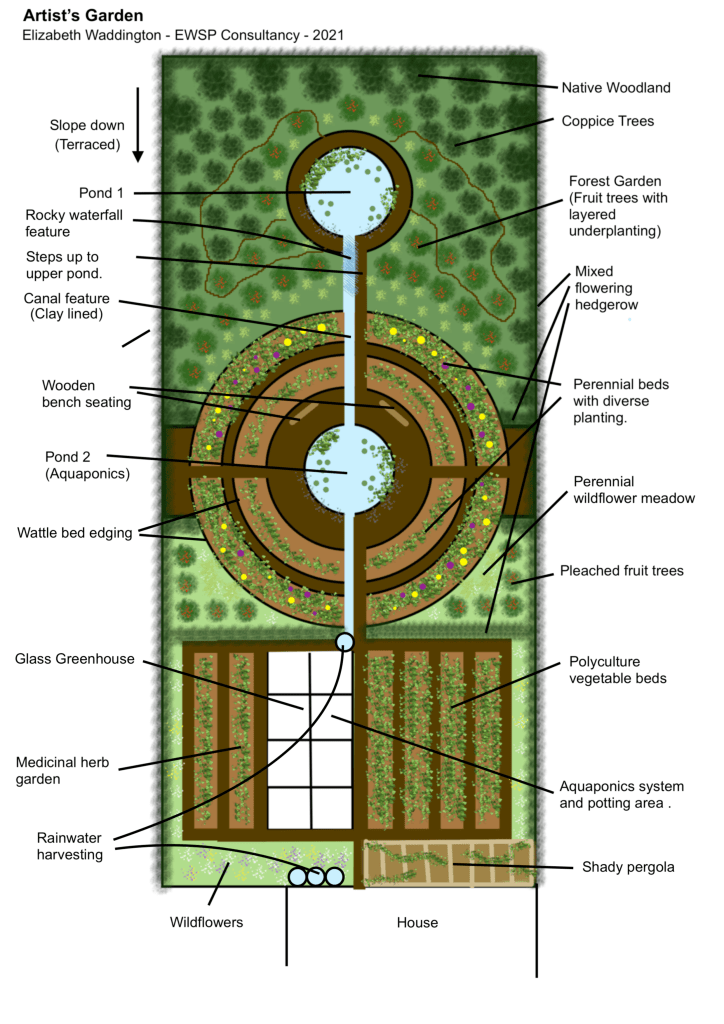 As you can see, I have suggested that coppice trees and a forest garden area are placed on this sloping section, with loose terracing along contours, and that a large pond should be created on the largest terrace. Steps will lead up to this pond, while a waterfall feature will allow excess water to cascade down (c. 80cm) into a clay-lined canal, which will feed a second pond (with fish) at the heart of the mandala perennial flower (and perennial edibles) garden. The water from this pond will, in turn, feed a modest aquaponics system in the large glass greenhouse.