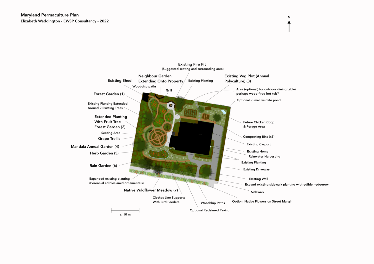 This design shows the expansion of existing vegetable growing areas and productive spaces into the existing lawn of a Maryland property.