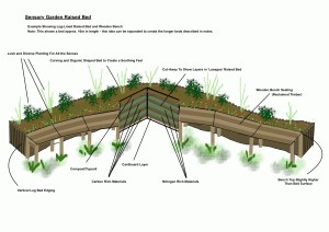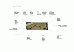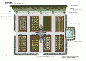 The image above shows part of a permaculture design for a riverside plot in India, with an approximate location for a new home, with a natural swimming pool. A path leads down between fruit trees and a forest garden to a seating area and polyculture vegetable beds situated near the riverside end of the property. Continue reading “Case Study: Tropical Garden” - Case Study: Sensory Garden For a Community Garden in Wales