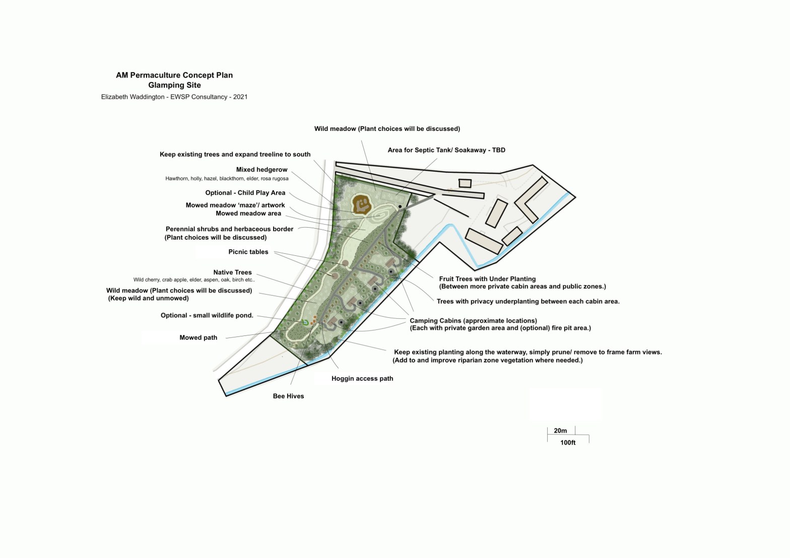 This permaculture design details planting and layout for a glamping site in Angus, Scotland. The site slopes gently down from the road towards a burn on the south east boundary of the site. Four camping cabins are planned, which will overlook the burn and neighbouring farm fields. As you can see from the plan above,Continue reading “Case Study: Glamping Site”