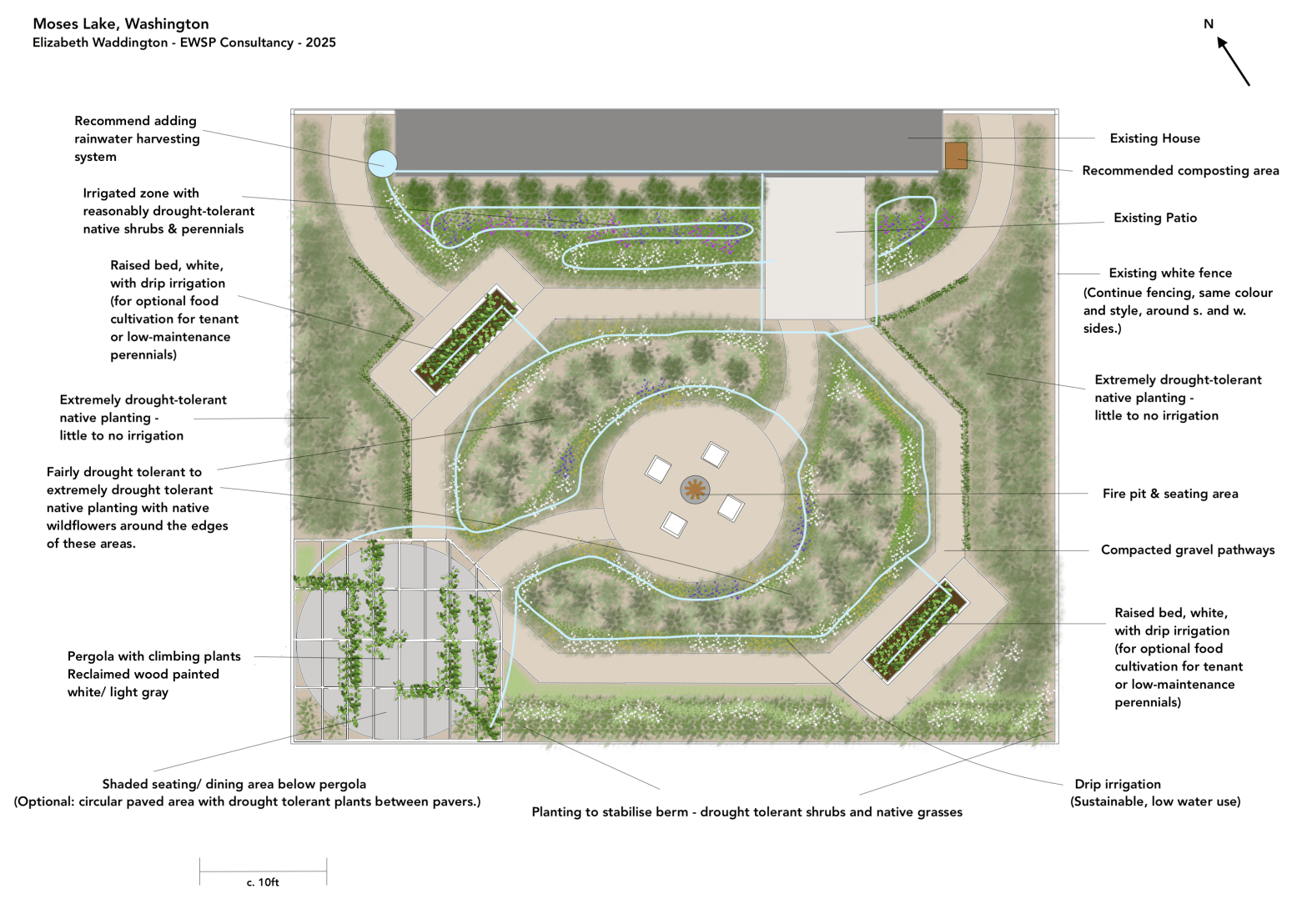 This is my design for the garden of a rental property on a former lake-bed in the municipality of Moses Lake, in Grant County, Washington. The priority for the client was creating a low-maintenance garden for current tenants to enjoy without making too large an investment. At present, the yard is near-barren silty sand withContinue reading “Washington State – Low-Maintenance & Drought-Tolerant Garden Design”