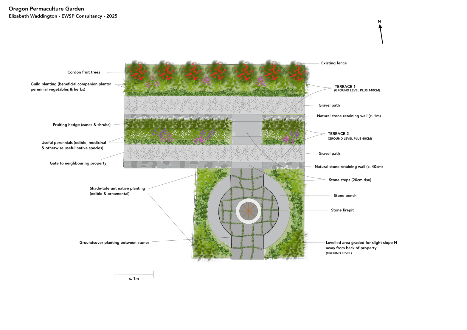 The image above shows my design for a relatively small city garden in Oregon. At present, the area is neglected, with a small yard outside the back door of the property to the south of the space, and a scrubby, overgrown slope, gentle at first then becoming much steeper, up to a fence at theContinue reading “Oregon Urban Permaculture Garden Design”